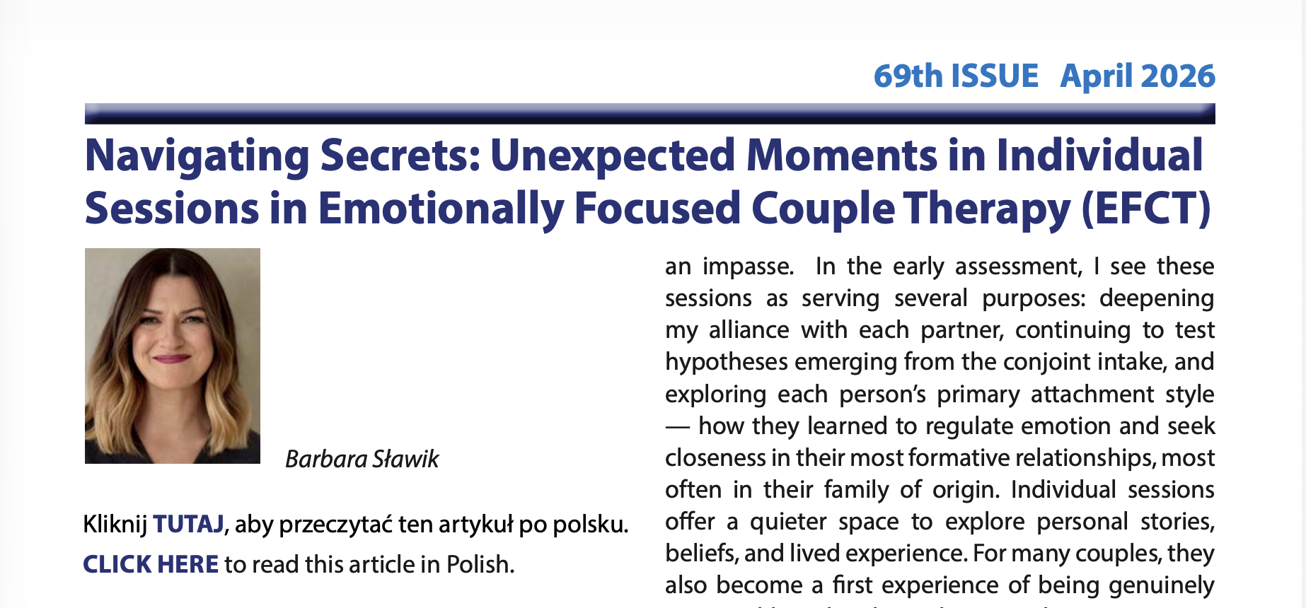 . 📢 We are pleased to share that the latest issue of the bimonthly journal “Niebieska Linia” (1/162/2026) features an article by Barbara Sławik titled “Violence and Couples Therapy. Working within the EFT Model” 📘 The author was invited to write this piece in…